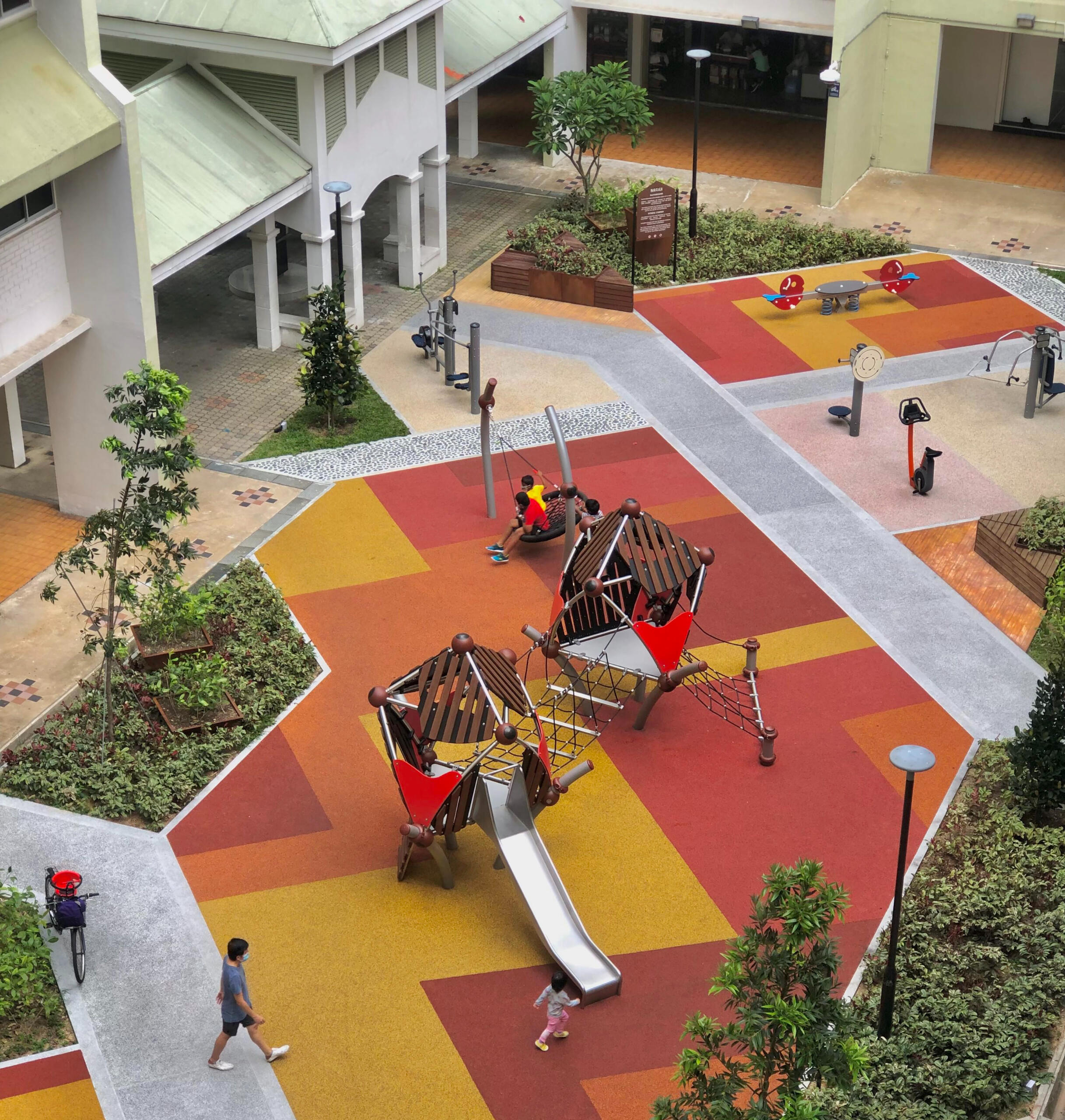 Nested between Blk 635, 636 and 638 Veerasamy Rd, this linear courtyard is an oasis within the highly-dense urban neighbourhood of Jalan Besar. It is today a popular after-school hangout for students, meeting point for neighbours, and leisure ground for families.Framed by the diagonal paths taken by residents, planes of play and respite punctuate the plaza, injecting colour and vitality into every nook and cranny. With the co-location of the playground, the adult and elderly fitness corner, multi-purpose court and children’s garden, generational boundaries between the residents are blurred through the common language of play and leisure.