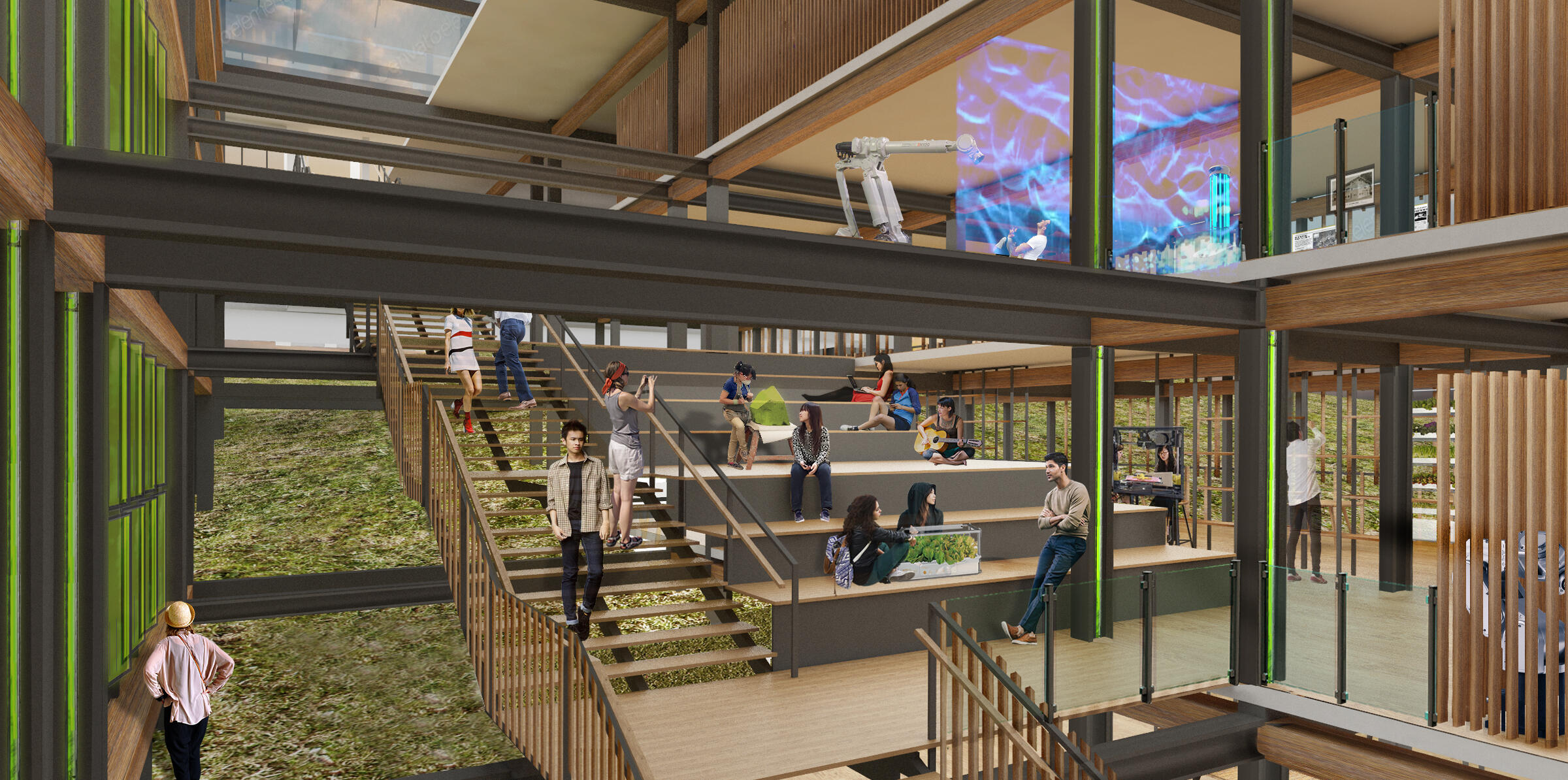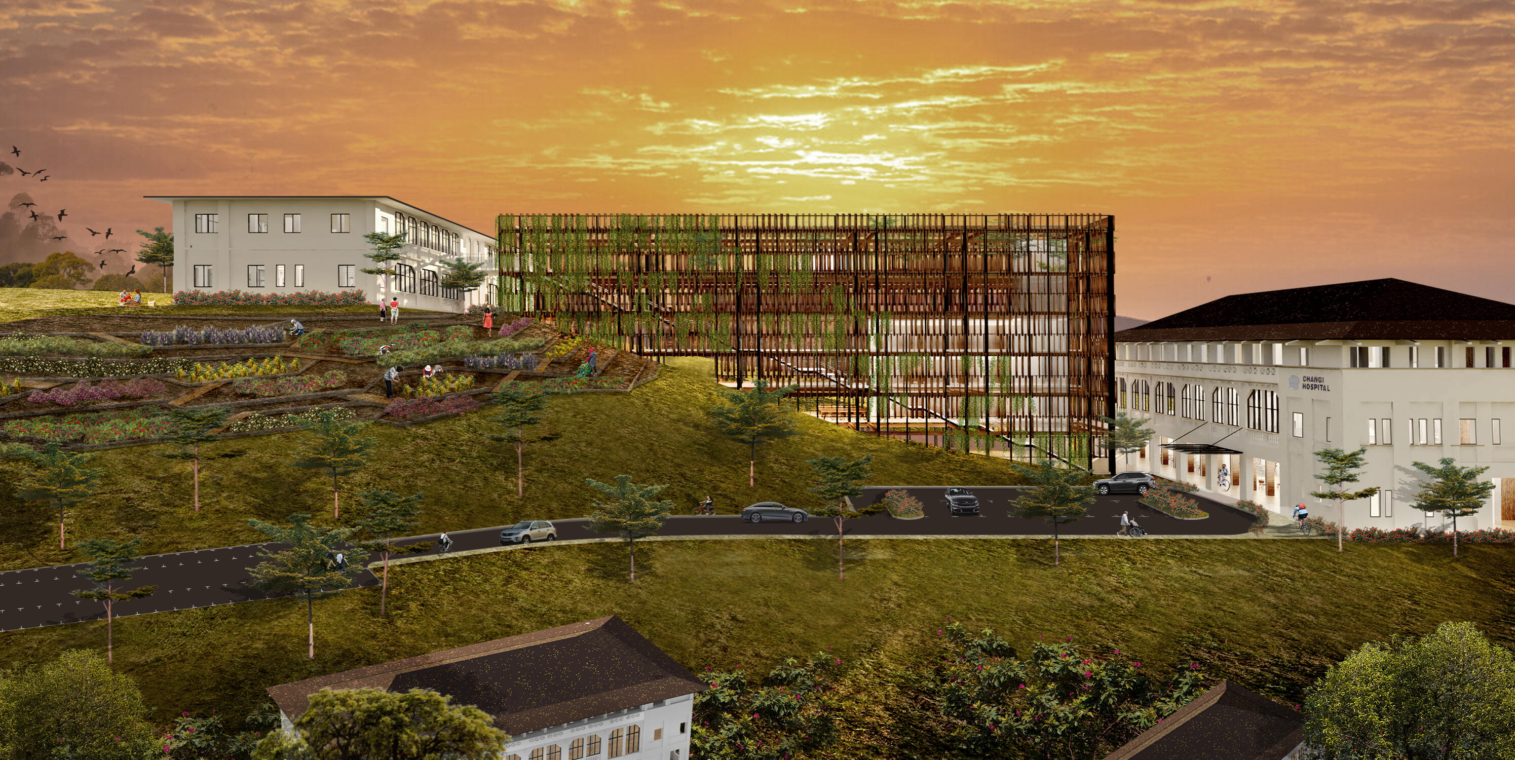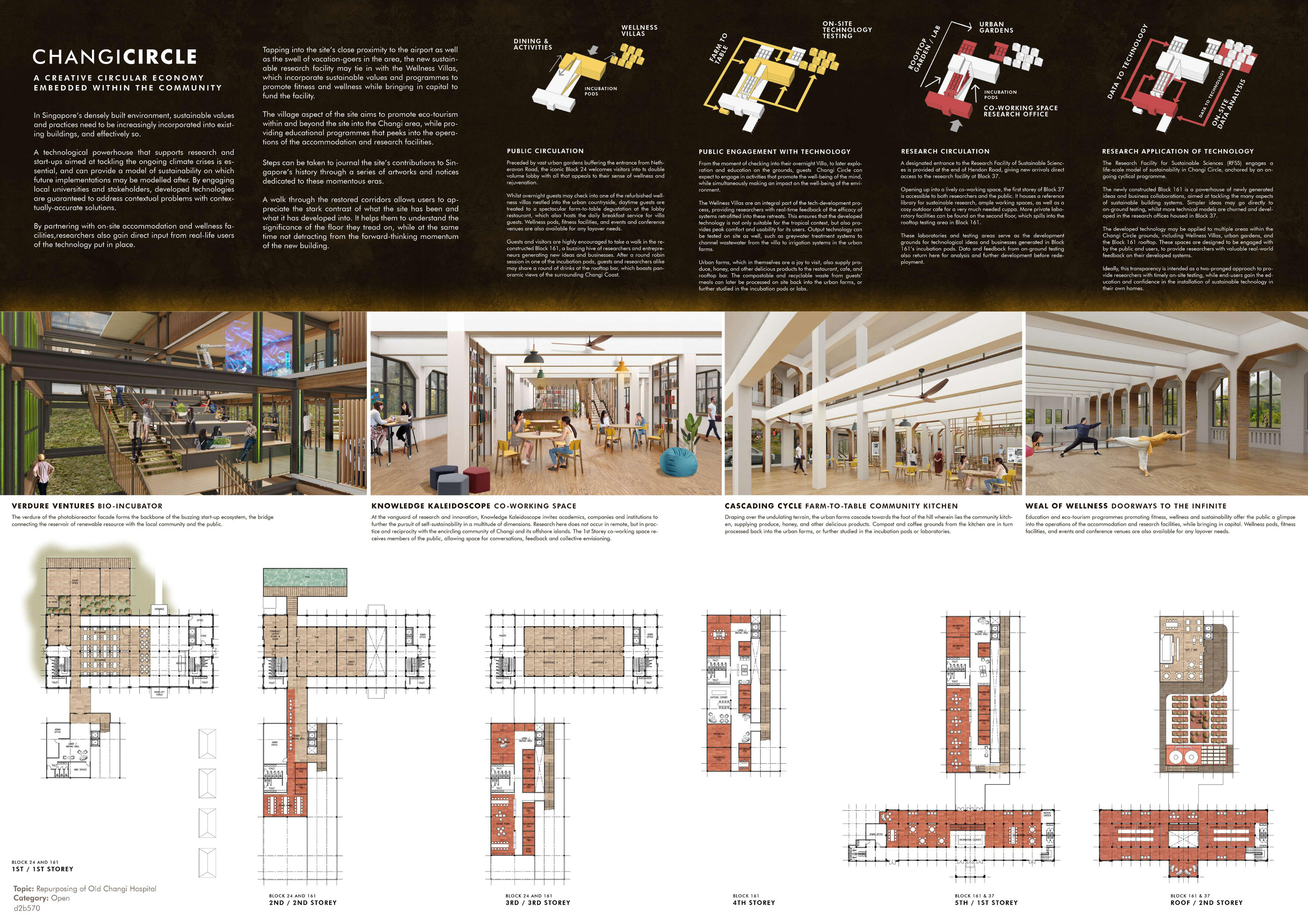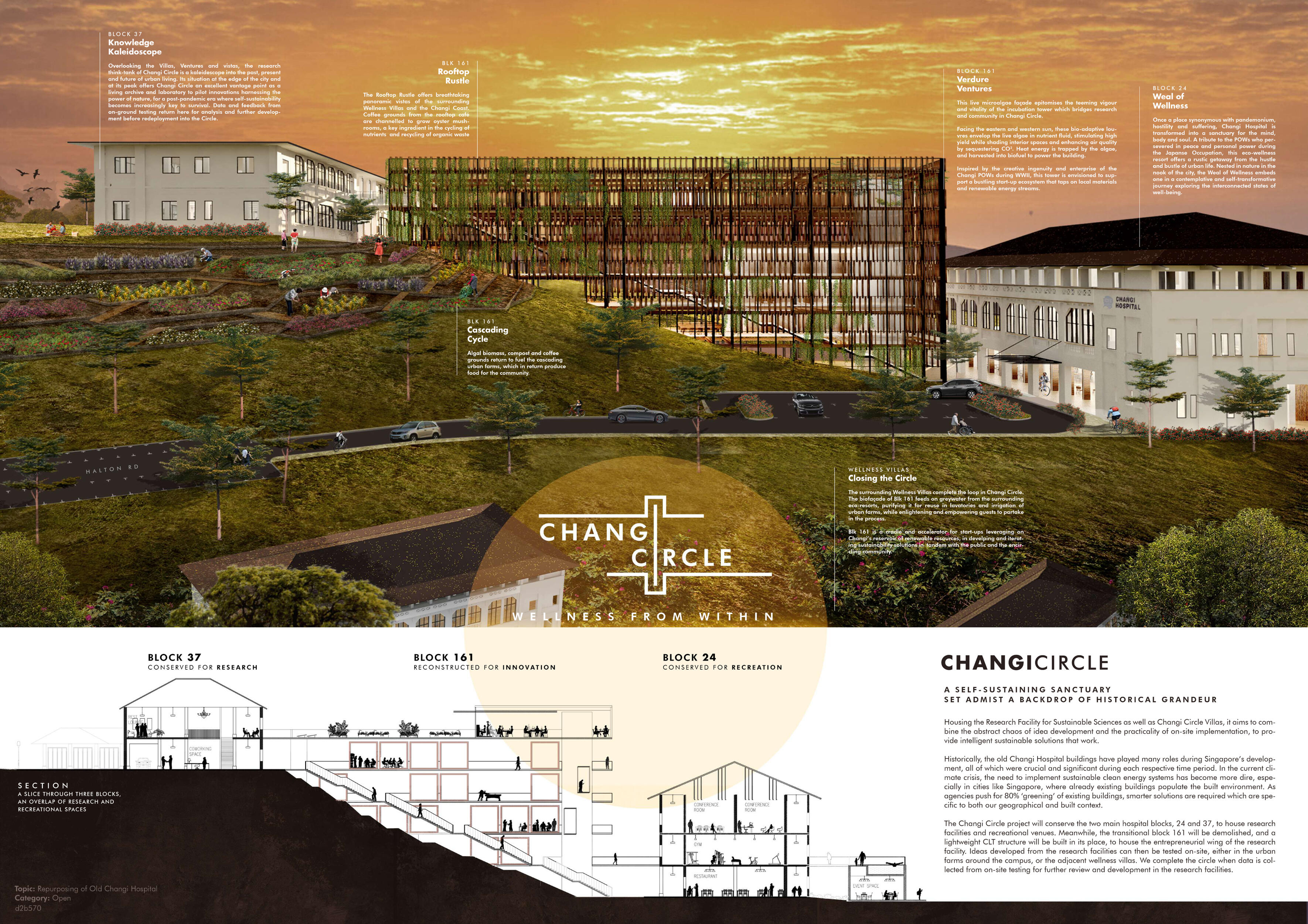 Changi Circle is a self-sustaining research and residential sanctuary that transforms Singapore's historic Changi Hospital site into a living laboratory for sustainable innovation.The project conserves heritage hospital blocks 24 and 37 as research and recreational facilities, while replacing block 161 with a lightweight CLT structure for entrepreneurial research activities.By integrating urban farms and wellness villas with research facilities, Changi Circle creates a circular feedback loop where sustainable solutions are developed, tested on-site, and refined based on real-world data—addressing Singapore's urgent need for context-specific approaches to greening existing buildings in dense urban environments.