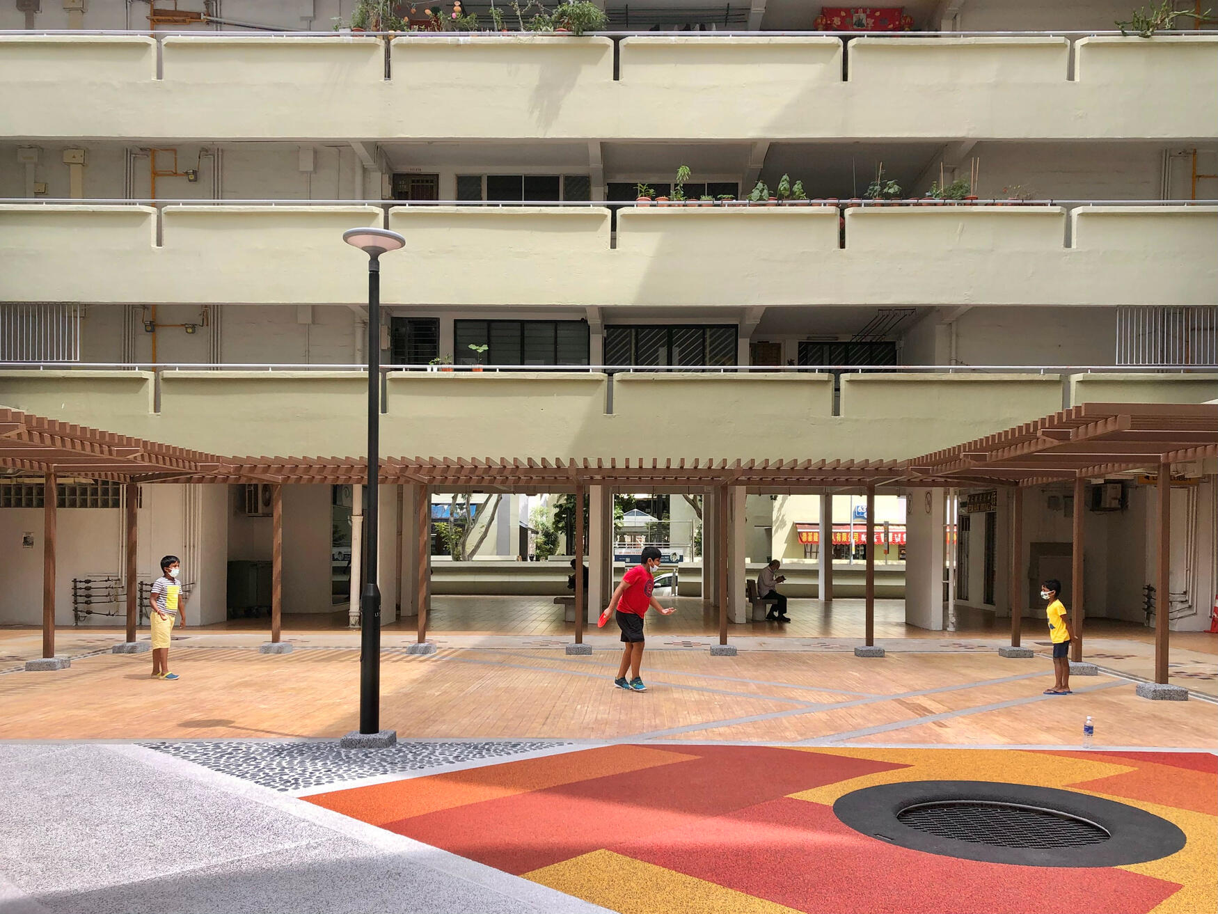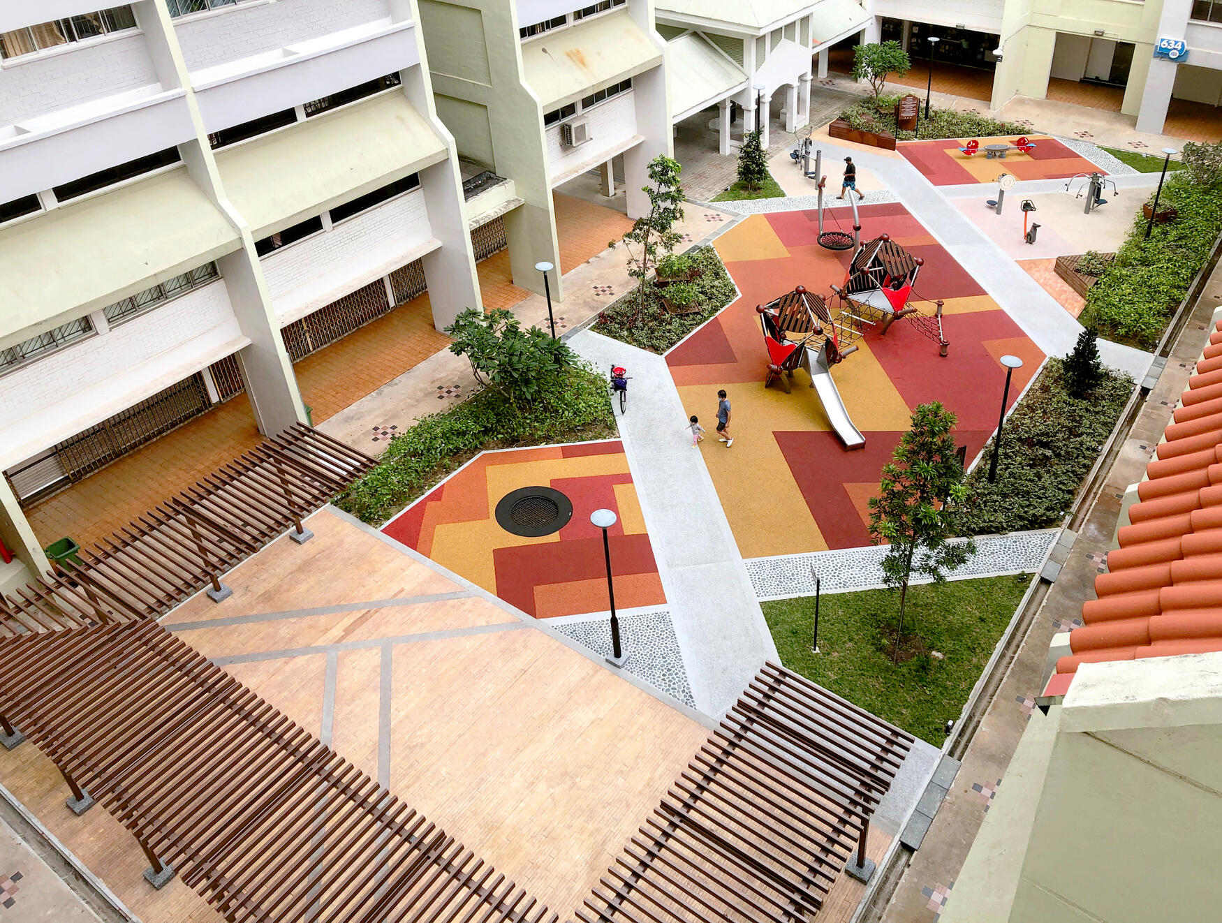 Nested between Blk 635, 636 and 638 Veerasamy Rd, this linear courtyard is an oasis within the highly-dense urban neighbourhood of Jalan Besar. It is today a popular after-school hangout for students, meeting point for neighbours, and leisure ground for families.Framed by the diagonal paths taken by residents, planes of play and respite punctuate the plaza, injecting colour and vitality into every nook and cranny. With the co-location of the playground, the adult and elderly fitness corner, multi-purpose court and children’s garden, generational boundaries between the residents are blurred through the common language of play and leisure.