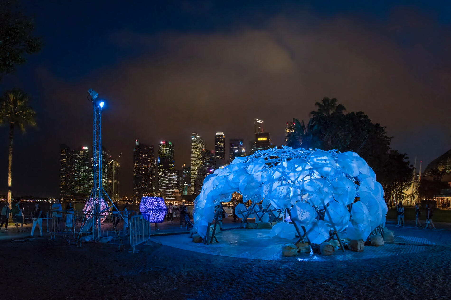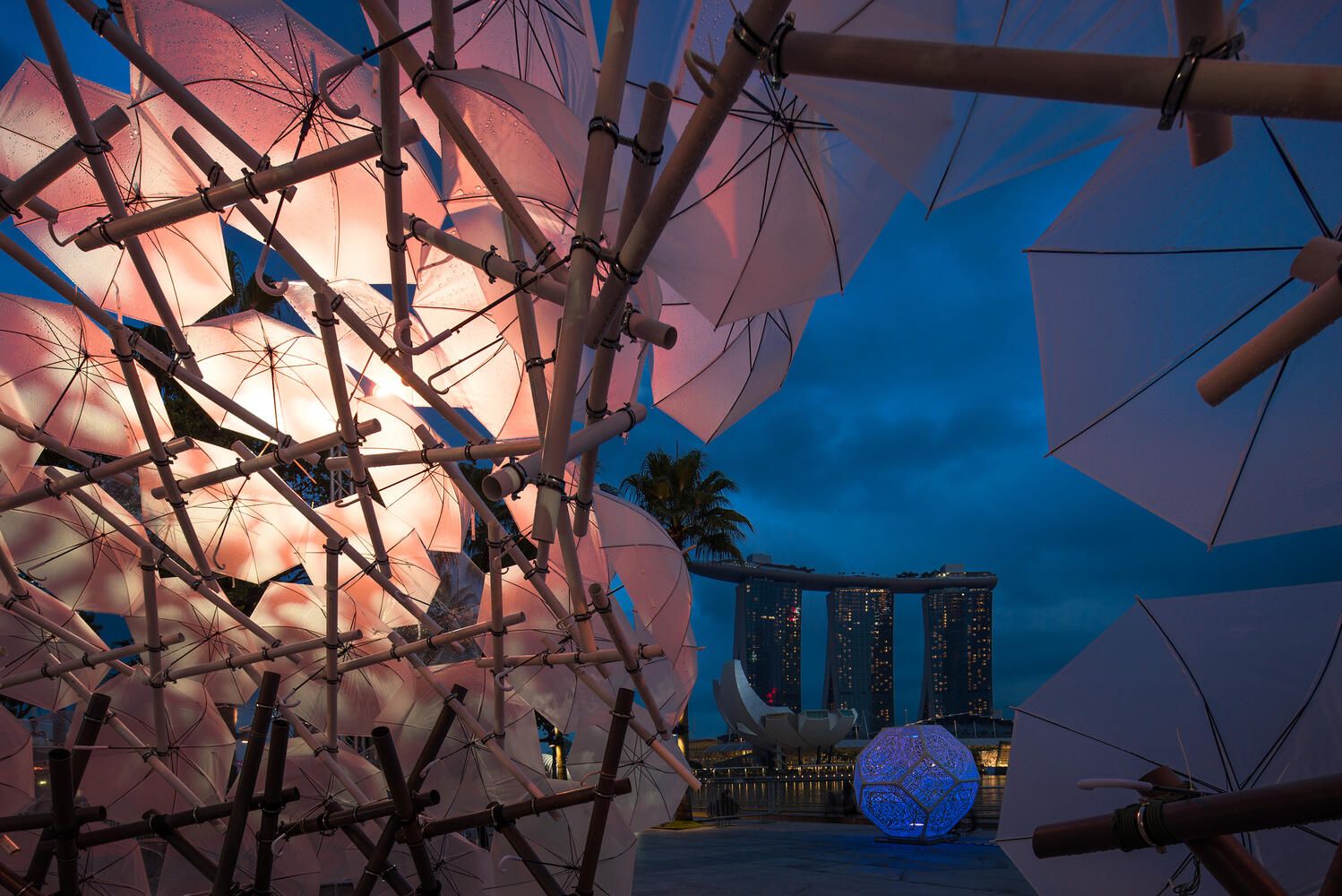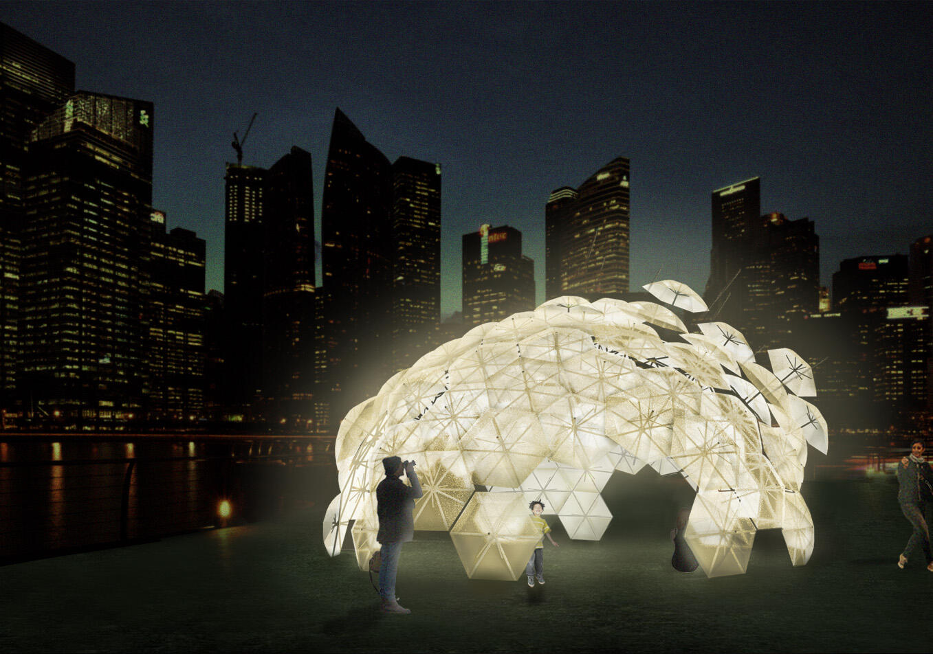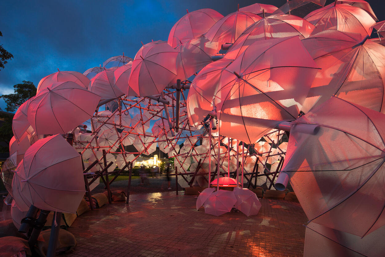 Dande-lier is designed for iLight Marina Bay 2017, an annual light festival initing contributors and installations by artists from all over the world.Umbrellas are held by seven layers of triangular PVC pipe modules, resting on each other to create a reciprocal dome structure. The pipes, commonly used in local construction are held together by galvanized iron pipe clamps and screwed together by a customized thread. The system makes Dande-lier both adaptable and easily deployable.On the inside, the view of the outside world is warped, transporting visitors into an alternate world, with a smart lighting system that responds dynamically to the visitors’ position in the sculpture. during the day the well ventilated dome provides shaded seating areas and respite from the heat.