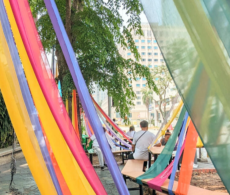 Fabric Forest is an urban installation that envisions to enliven and enhance this leftover pocket of space by transforming it into a vibrant gateway into the Kampong Gelam district, and laying a blank canvas for community adaptations, gatherings and pop-ups.Drawing from the district’s past as a port for pilgrims en route to Mecca, this installation offers a sanctuary for spiritual respite, rejuvenation and reflection. Made up of a euphony of canopies and tiered seatings, the installation weaves together a myriad of grounds for congregation and respite under the majestic shade of the Angsana trees. The forest of fabrics encircling the trees enfold and unveil with the ebb and flow of pedestrian traffic, bringing to fore the textile heritage and charm that continue to define Kampong Gelam today.